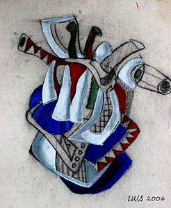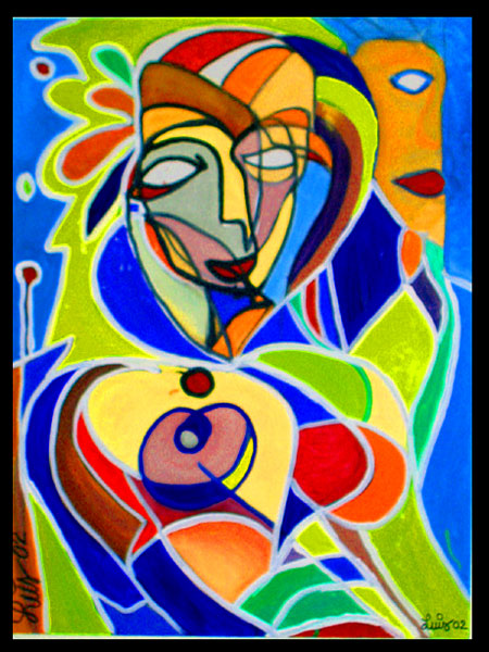 Luis’s art embodies bold abstraction, emotional intensity, and a distinct visual language grounded in geometry, color contrast, and expressive facial features. Though the image here isn't a painting per se, it reflects his broader visual sensibility.