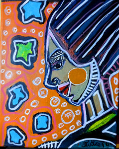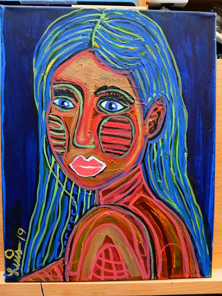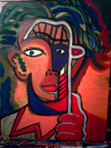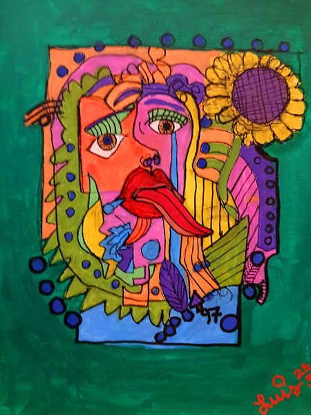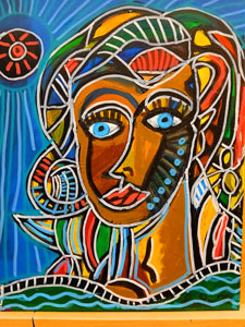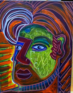 ---From his paintings section on his website. It features his signature style—vivid, expressive colors, bold outlines, and a fragmented, geometric treatment of the human face—qualities that match his described approach.