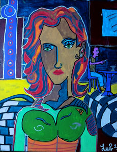 According to his own site, TorresCamacho is a Fine Art Painter working in acrylics, oils, and digital media. He focuses primarily on expressive depictions of women’s faces and bodies, using bold primary and secondary colors. His technique of deconstructing the face into geometric sections and emphasizing features like eyes and mouths with stark black strokes gives his work a unique emotive power.