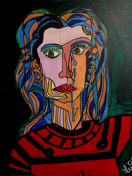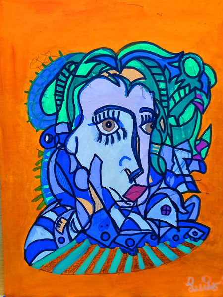 The face and body are broken into bold, angular sections, each filled with different colors and patterns, reminiscent of a modernized Picasso influence.